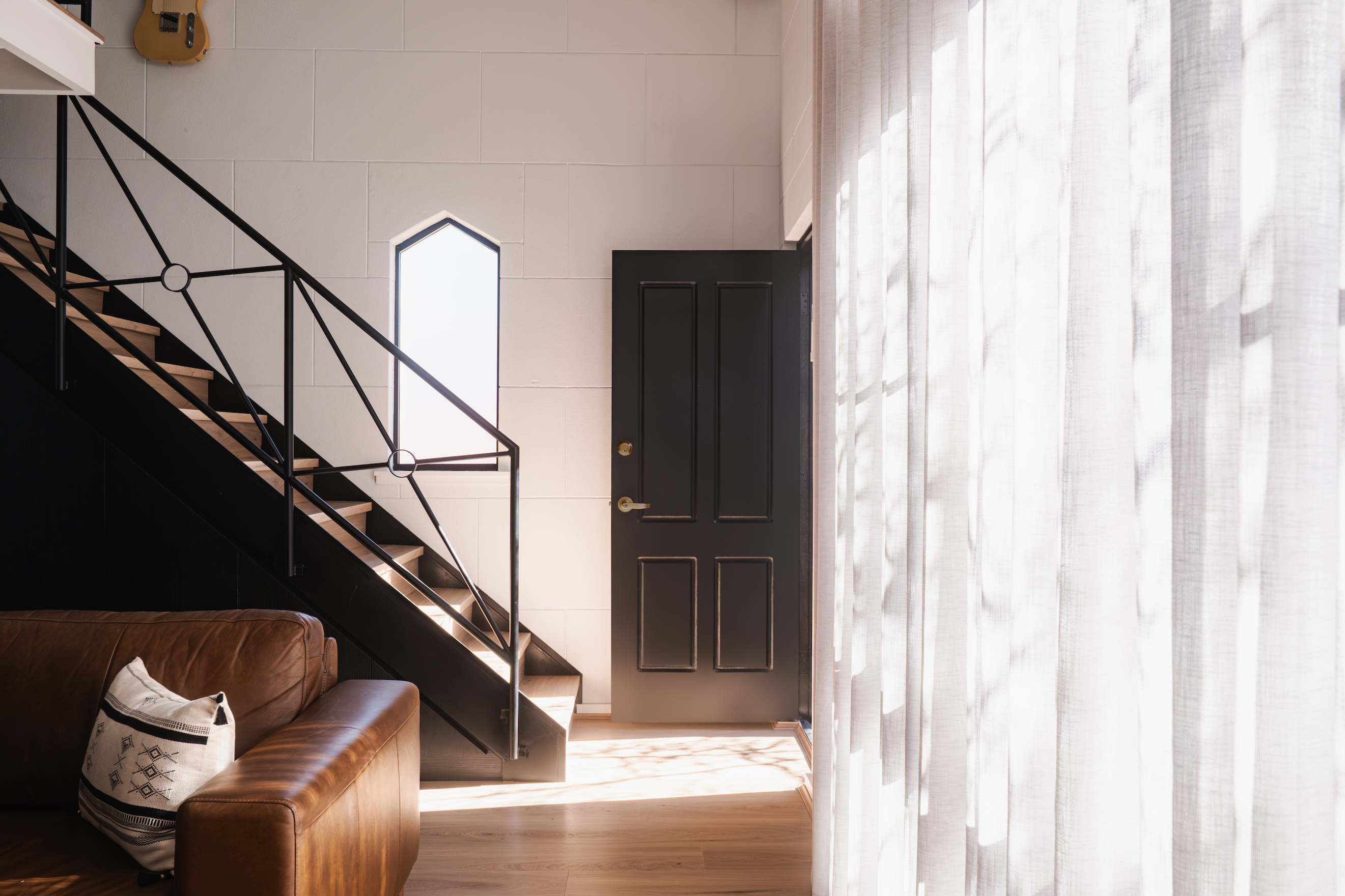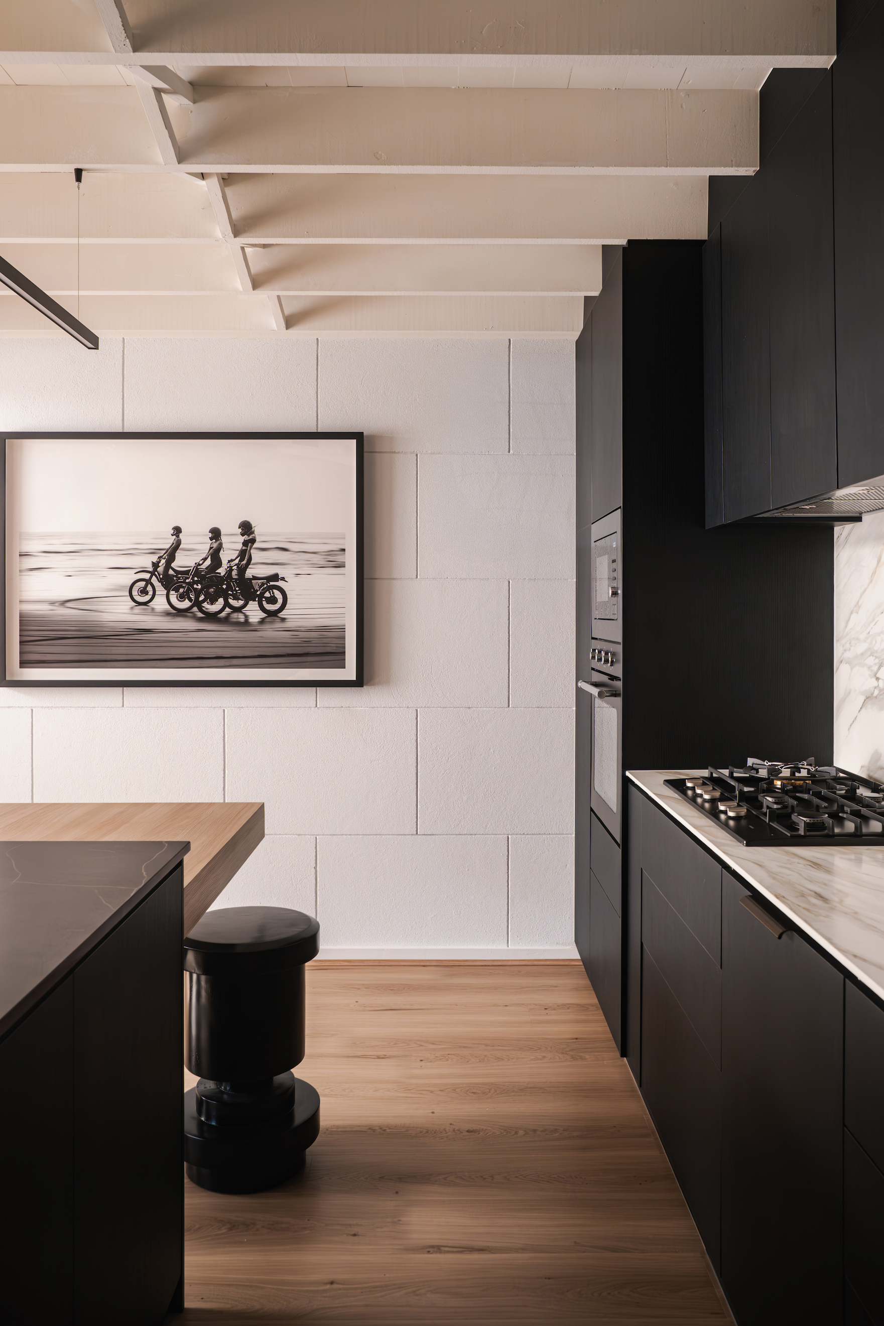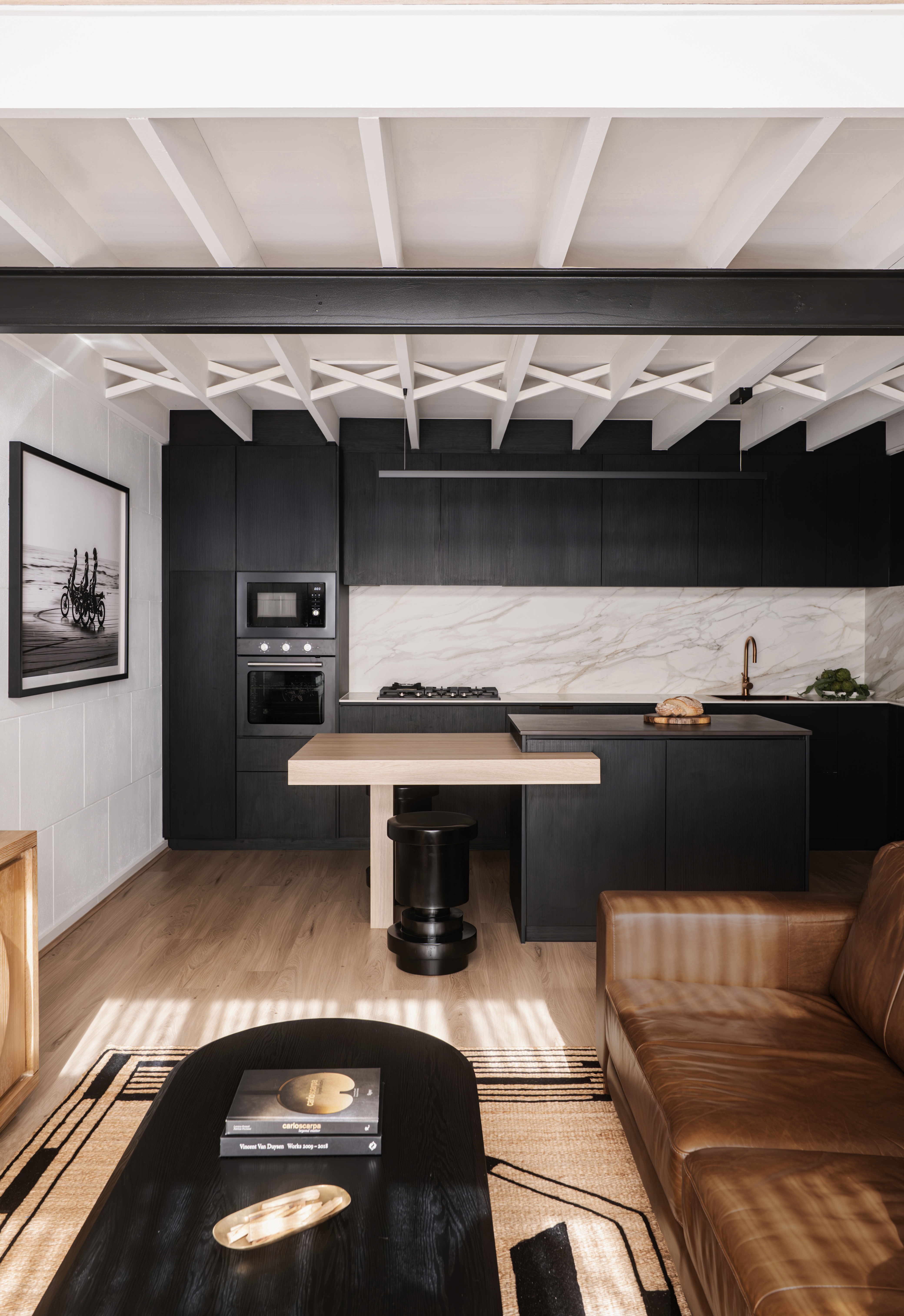Our Hudson Project reimagines an inner-city loft into asleek, low-maintenance retreat tailored for both relaxation and entertaining. The design juxtaposes industrial elements, such as exposed steel timber beams, with a polished interior, blending timber flooring and a moody palette. The cleverly optimized kitchen and thoughtful furniture arrangement ensure that space limitations do not hinder functionality or style. Natural fibres, leather accents, and earthy tones enrich the ambiance, while bold art selections injects striking personality. The loft's white-washed walls are thoughtfully balanced with darker elements, including furniture and dark-stained kitchen cabinets, creating a harmonious, understated environment that captures the essence of contemporary sophistication.